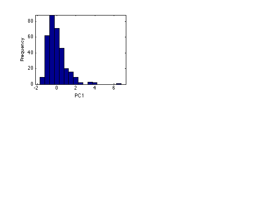 % Note that the data array for k-means cluster analysis in Matlab should % have rows correspond to the n samples and columns to the m variables, load cities % Make an n x m matrix R R = ratings; [n m] = size(ratings); Rmean = ones(n,1)*mean(R); % nxm matrix whose cols are filled with the % mean of S for that col Rstd = ones(n,1)*std(R); % nxm matrix whose cols are filled with the % standard deviation of S for that cols R = (R - Rmean)./Rstd; % Ratings data matrix R is now normalized % [U,SigmaV,lambda] = pca(R); PC1 = SigmaV(:,1); PC1 = PC1/std(PC1); % Standardize for simplicity of interpretation subplot(2,2,1) xbin = -2:0.5:7; hist(PC1,xbin) axis tight xlabel('PC1') ylabel('Frequency')