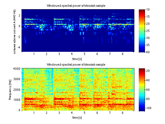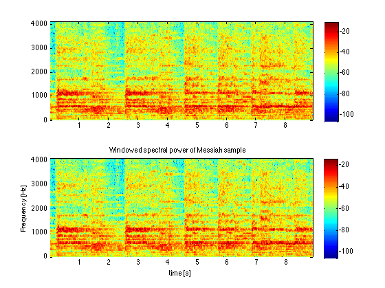 Nw = 256; j = 1:Nw; w = 0.5*(1-cos(2*pi*(j-1)/Nw))'; % Hanning window of length Nw: % SP toolbox: w=hanning(Nw,'periodic') varw = 3/8; % Mean-square value of taper function w (used to % renormalize power spectrum). % Segment the data into 'full' and 'half' windows, arrayed in columns nwinf = floor(Ny/Nw); % Number of 'full' windows starting each Nw samples nwinh = nwinf - 1; % Number of 'half' windows (half-way between fulls) nwin = nwinf+nwinh; yw = zeros(Nw,nwin); % Define array in which to insert windowed data yw(:,1:2:nwin) = reshape(y(1:nwinf*Nw),Nw,nwinf); yw(:,2:2:(nwin-1)) = reshape(y((1+Nw/2):(nwinf-0.5)*Nw),Nw,nwinh); % Taper each column (i. e. the data in each window) wmx = repmat(w,[1 nwin]); yt = wmx.*yw; % DFT and power spectrum of each column ythat = fft(yt); S = (abs(ythat/Nw).^2)/varw; %Windowed power spectrum S = S(1:Nw/2,:); % Only keep nonnegative harmonics for plotting SdB = 10*log10(S); % log of spectrum in decibel-like units Mw = 0:(Nw/2 - 1); % Nonnegative windowed harmonics fw = Fs*Mw/Nw; % "Frequencies'(inverse periods in Hz) of these harmonics tw = (1:nwin)*0.5*Nw/Fs; % Center time of each window % Plot the power spectra (log or decibel scale) vs. window time subplot(2,1,2) % Add offsets and padding so pcolor centers each cell on (tw,fw) % and last row/col of field is included in plots dfw = fw(2)-fw(1); dtw = tw(2)-tw(1); fwpad = [fw fw(end)+dfw]-0.5*dfw; twpad = [tw tw(end)+dtw]-0.5*dtw; SdBpad = SdB([1:end end],[1:end end]); pcolor(twpad,fwpad,SdBpad) xlabel('time [s]') ylabel('Frequency [Hz]') title('Windowed spectral power of Messiah sample') shading flat colorbar