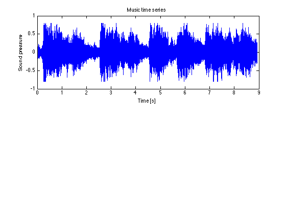 figure(1) clf subplot(2,1,1) plot((1:Ny)/Fs,y); xlabel('Time [s]'); ylabel('Sound pressure'); title('Music time series');