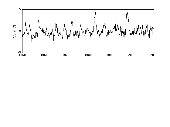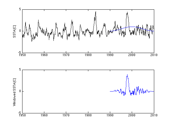load SSTA; % loads decimal year yr and Nino3.4 SSTA [C]. vartot = mean(SSTA.^2); Nwyr = 20; % Window length in years (User-modifiable-try 10 or 30) figure(1) clf subplot(2,1,1) plot(yr,SSTA,'k') ylabel('SSTA [C]') xlim([1950 2010]) ylim([-5 5])
