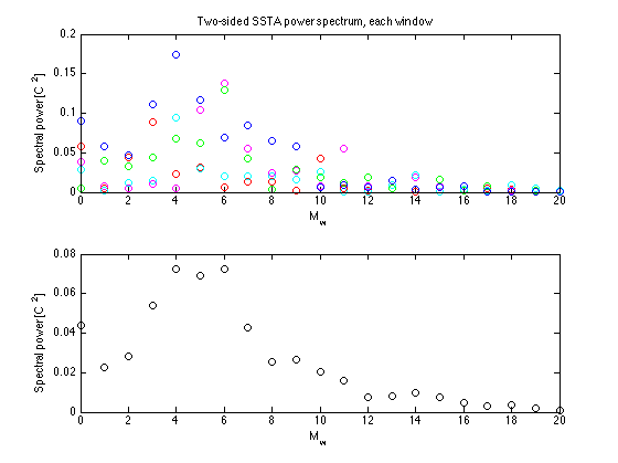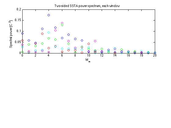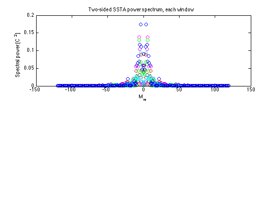 SSTAwhat = fft(SSTAw); % Spectrum simultaneously computed % column-wise for all windows figure(2) clf subplot(2,1,1) % Windowed power spectra Mw=[0:(Nw/2-1) -Nw/2:-1]; % Harmonics for windowed DFT for iw = 1:nwin Sw = abs(SSTAwhat/Nw).^2/varw; iwc = mod(iw-1,5)+1; % Cycle through the 5 colors plot(Mw,abs(Sw(:,iw)),[icolor(iwc) 'o']) xlabel('M_w') ylabel('Spectral power [C^2]') hold on end hold off title('Two-sided SSTA power spectrum, each window')