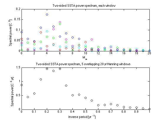 % Replot using inverse period M/Nwyr as horizontal scale instead % of M. To make the horizontal integral over all inverse periods % (positive and negative) still equal to the power, % renormalize spectral power by Nwyr. plot(Mw/Nwyr,Swav*Nwyr,'ko') xlim([0 1]) % Frequency range to plot [1/yr] xlabel('Inverse period [yr^{-1}]') ylabel('Spectral power [C^2 yr]') title(['Two-sided SSTA power spectrum, ' int2str(nwin) ' overlapping ' ... int2str(Nwyr) ' yr Hanning windows'])