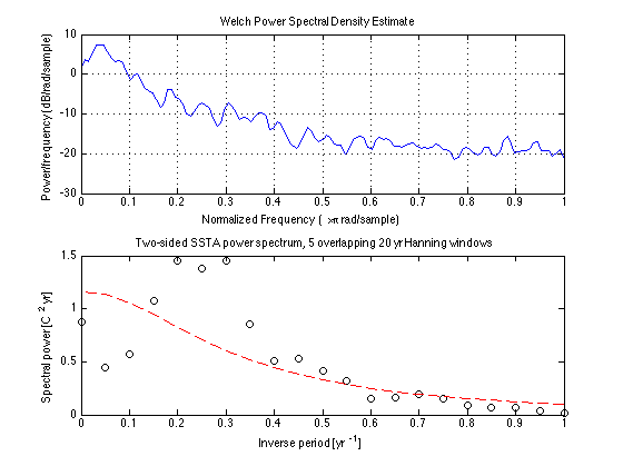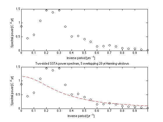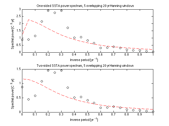 subplot(2,1,1) Mw_1s = [0:(Nw/2)]; Swav_1s = [Swav(1); 2*Swav(2:Nw/2); Swav(Nw/2 + 1)]; % Col vector ps_red_1s = [ps_red(1) 2*ps_red(2:Nw/2) ps_red(Nw/2 + 1)]; % Row vector plot(Mw_1s/Nwyr,Swav_1s*Nwyr,'ko') hold on plot(Mw_1s/Nwyr,ps_red_1s*Nwyr,'r--') xlim([0 1]) % Frequency range to plot [1/yr] xlabel('Inverse period [yr^{-1}]') ylabel('Spectral power [C^2 yr]') title(['One-sided SSTA power spectrum, ' int2str(nwin) ' overlapping ' ... int2str(Nwyr) ' yr Hanning windows']) hold off