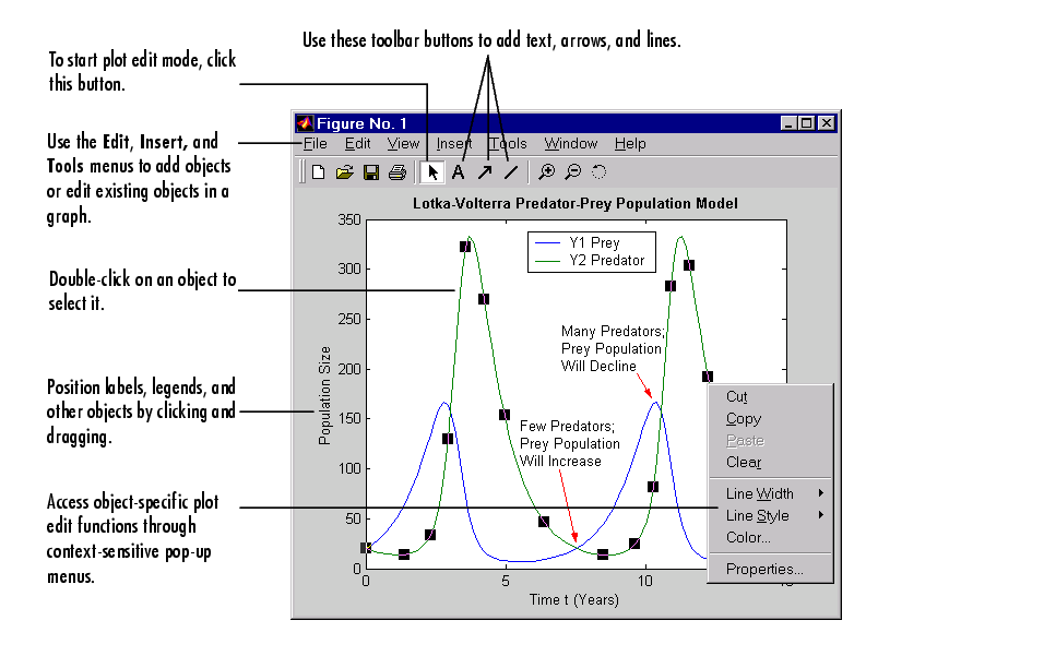 The MATLAB figure window supports a point-and-click style editing mode that you can use to customize the appearance of your graph. This section describes how to start plot edit mode and perform basic editing tasks, including: