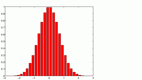 x = -2.9:0.2:2.9; bar(x,exp(-x.*x)) colormap hsv