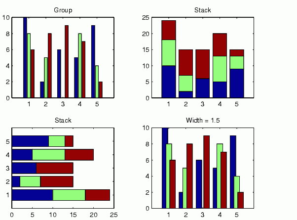 'group' displays n groups of m vertical bars, where n is the number of rows and m is the number of columns in Y. The group contains one bar per column in Y. 'stack' displays one bar for each row in Y. The bar height is the sum of the elements in the row. Each bar is multi-colored, with colors corresponding to distinct elements and showing the relative contribution each row element makes to the total sum.bar(..., displays all bars using the color specified by LineSpec)