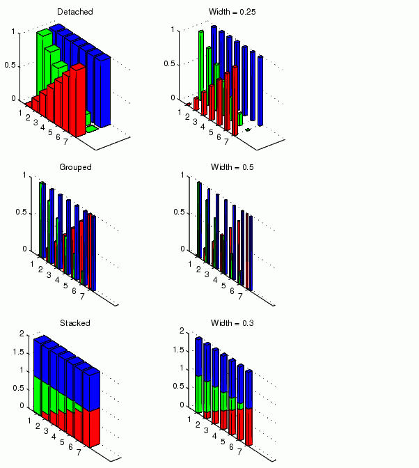 subplot(3,2,6) bar3(Y,0.3,'stacked') title(`Width = 0.3')
