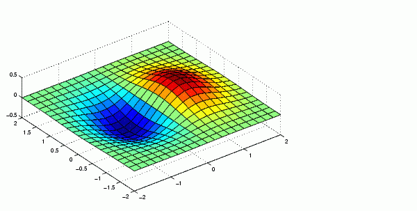 [x,y] = meshgrid([-2:.2:2]); z = x.*exp(-x.^2 - y.^2); surf(x,y,z)