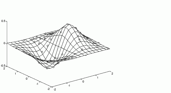 mesh(XI,YI,ZI), holdplot3(x,y,z,'o'), holdoff