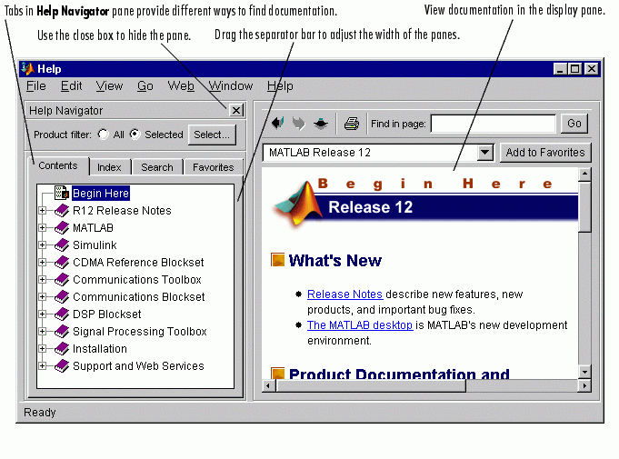 Display the MATLAB Help browser, providing access to extensive online help