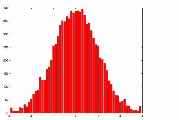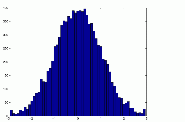 x = -2.9:0.1:2.9;y = randn(10000,1); hist(y,x)