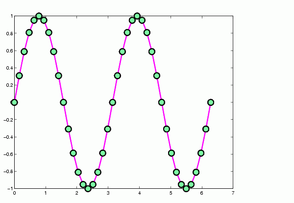 plot(t,sin(2*t),'-mo',... 'LineWidth',2,... 'MarkerEdgeColor','k',... 'MarkerFaceColor',[.49 1 .63],... 'MarkerSize',12)
