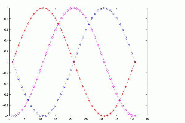 t = 0:pi/20:2*pi; plot(t,sin(t),'-.r*') hold on plot(sin(t-pi/2),'--mo') plot(sin(t-pi),':bs') hold off