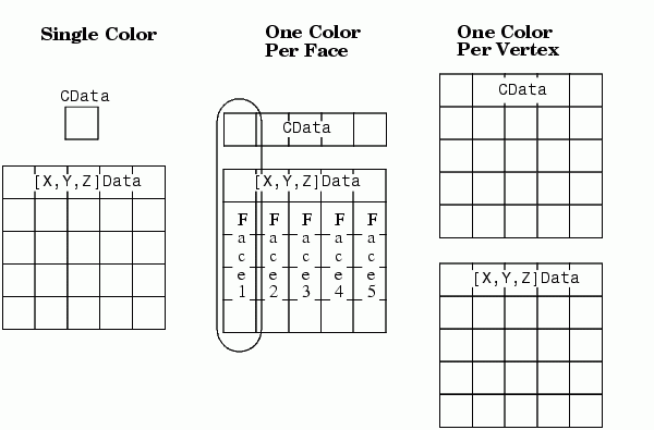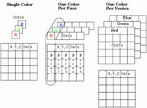 Faces property, which specifies one color per faceVertices property, which specifies one color per vertexThe following diagram illustrates the various forms of the FaceVertexCData property for a patch having eight faces and nine vertices. The CDataMapping property determines how MATLAB interprets the FaceVertexCData property when you specify indexed colors.
