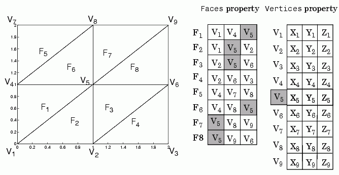 The corresponding Faces and Vertices properties are shown to the right of the patch. Note how some faces share vertices with other faces. For example, the fifth vertex (V5) is used six times, once each by faces one, two, and three and six, seven, and eight. Without sharing vertices, this same patch requires 24 vertex definitions.