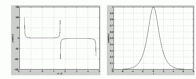 x1 = -pi/2+0.01:0.01:pi/2-0.01; x2 = pi/2+0.01:0.01:(3*pi/2)-0.01; plot(x1,sec(x1),x2,sec(x2)) x = -2*pi:0.01:2*pi; plot(x,sech(x))