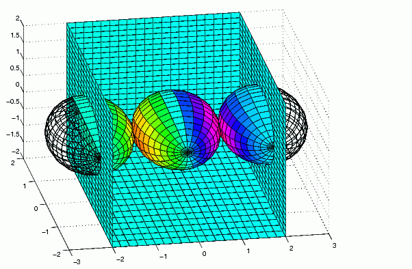 [x,y,z] =meshgrid(-2:.2:2,-2:.25:2,-2:.16:2); v = x.*exp(-x.^2-y.^2-z.^2); xslice = [-1.2,.8,2]; yslice = 2; zslice = [-2,0];slice(x,y,z,v,xslice,yslice,zslice) colormap hsv