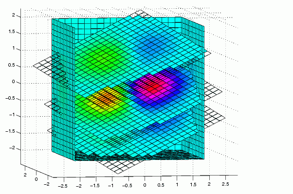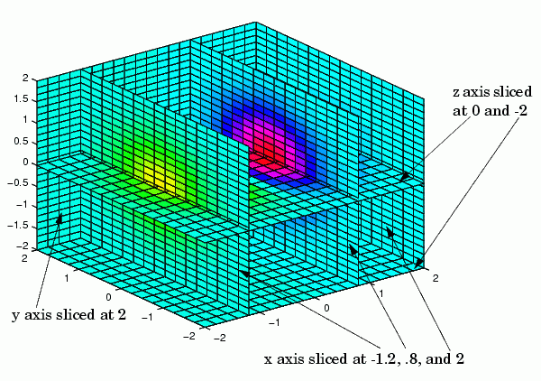 slice(x,y,z,v,[-2,2],2,-2) % Draw some volume boundaries