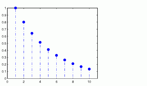 y = linspace(0,2,10);stem(exp(-y),'fill','-.')axis ([0 11 0 1])