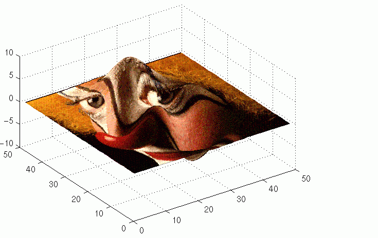 load clown surface(peaks,flipud(X),... 'FaceColor','texturemap',... 'EdgeColor','none',... 'CDataMapping','direct') colormap(map) view(-35,45)