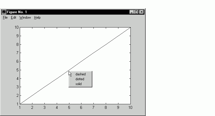 % Define the context menu cmenu = uicontextmenu; % Define the line and associate it with the context menu hline = plot(1:10, 'UIContextMenu', cmenu); % Define callbacks for context menu items cb1 = ['set(hline, ''LineStyle'', ''--'')']; cb2 = ['set(hline, ''LineStyle'', '':'')']; cb3 = ['set(hline, ''LineStyle'', ''-'')']; % Define the context menu items item1 = uimenu(cmenu, 'Label', 'dashed', 'Callback', cb1); item2 = uimenu(cmenu, 'Label', 'dotted', 'Callback', cb2); item3 = uimenu(cmenu, 'Label', 'solid', 'Callback', cb3);