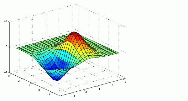 [x,y] = meshgrid([-1.75:.2:3.25]); z = x.*exp(-x.^2-y.^2); surf(x,y,z) xlim([-1.75 3.25]) ylim([-1.75 3.25])