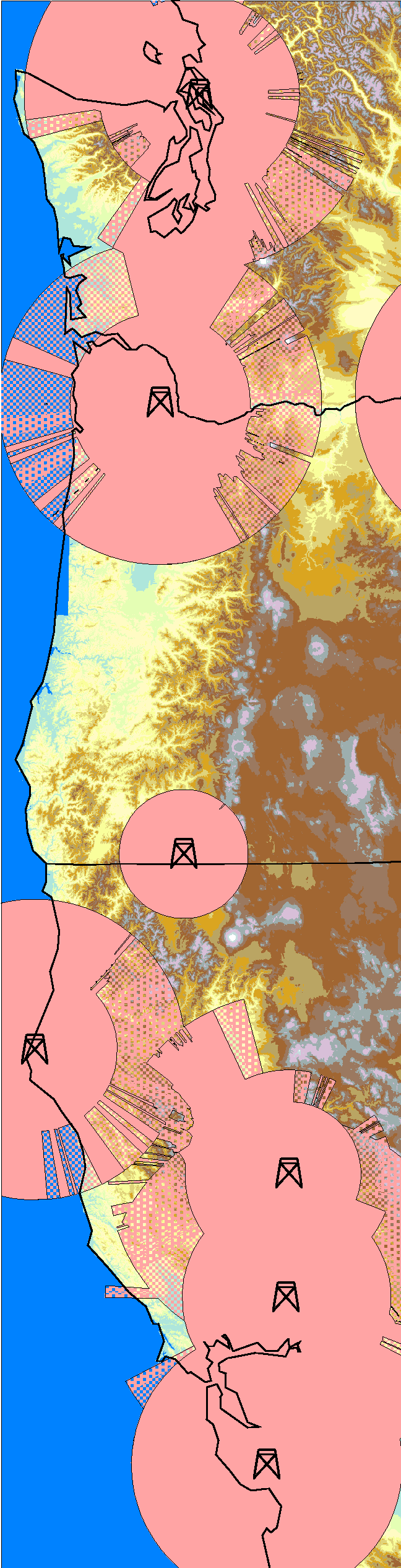 The National Weather Service installed three radars to provide coverage over western Washington and western Oregon: Camano Island (WA), Portland (OR) and Medford (OR). The figures shown below indicate their locations and provide more exact coverage maps using high-resolution terrain.