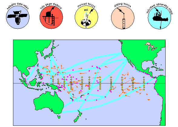 Shown here are some of the components of the ocean observing system that are being deployed in support of El Niño prediction. The red dots are automatic tide gage stations. The yellow squares and diamonds show the locations of moored buoys, which monitor surface wind and other weather elements, as well as water temperatures at several levels below the ocean surface. They operate continuously for months at a time without human intervention. The pink arrows depict the tracks of drifting buoys which measure water temperature and reveal the motion of the surface water. The blue lines represent the tracks of merchant ships that take ocean soundings. Many of these observations are sent directly to weather prediction centers around the world via satellite.