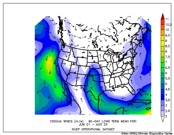 In the summer, the wind pattern is the same, except it is shifted northwest.