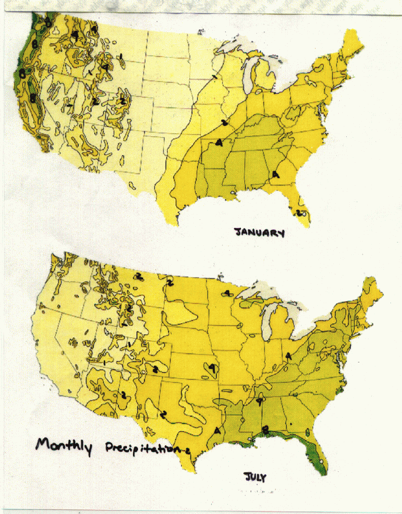Looking at the Rocky Mountains in terms of precipitation, we see the affects of a Rain Shadow. At least this is the pattern for the winter months. As you can see on the precipitation map of January the west side of the Rockies recieves much more precipitation than the east side and the Plains as well. The map for July's precipitaion shows a different story. This pattern is largely due to the fact that the Gulf of Mexico swirls warmer and moister weather systems into the Plains and onto the eastside of the Rockies. As a whole the Plains experience low counts of precipitation and humidity with the major source of precipitation coming from the Gulf of Mexico during the spring and summer months. The southern Plais recieve 15-25 inches of precipitation annually while the northern Plains recieve only about 12-15 inches annually.
