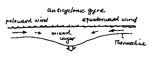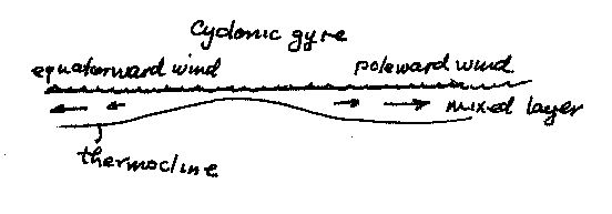 thermocline (and the nutrients) upward in the center of the gyre, which
