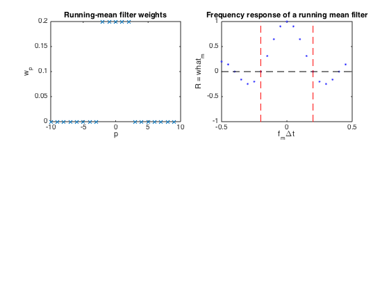 N = 20; % Length of time series Nav = 5; % Number of samples to average across (should be odd) P = (Nav-1)/2; % Define weight vector for running mean filter and take DFT w = [ones(1,P+1) zeros(1,N-Nav) ones(1,P)]/Nav; what = fft(w); M = [0:(N/2-1) -N/2:-1]; % Plot filter weights clf subplot(2,2,1) plot(M,w,'x') xlabel('p') ylabel('w_p') title('Running-mean filter weights') % Plot frequency response. The filter zeroes out a sinusoidal signal of % period Nav*dt, whose corresponding freq is at vertical dashed red lines. subplot(2,2,2) plot(M/N,what,'b.',[-0.5 0.5],[0 0],'k--',... (1/Nav)*[1 1],[-1 1],'r--',(1/Nav)*[-1 -1],[-1 1],'r--') xlim([-0.5 0.5]) ylim([-1 1]) xlabel('f_m\Deltat') ylabel('R = what_m') title('Frequency response of a running mean filter') % The running-mean filter has strong 'side-lobes' that pass high-frequency % signals that are outside the desired pass-band. Thus, despite its % simplicity, this filter is easily outperformed.