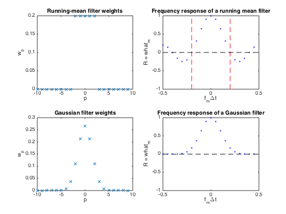 % Define weight vector for running mean filter and take DFT Pg=1.5; % Set filter width to have a similar pass-band to running-mean w = exp(-M.^2/(2*Pg^2)); w = w/sum(w); % Normalize so low-pass response is 1 what = fft(w); M = [0:(N/2-1) -N/2:-1]; % Plot filter weights...w could be truncated at p = +/- 3*Pg without % significant loss of accuracy. subplot(2,2,3) plot(M,w,'x') xlabel('p') ylabel('w_p') title('Gaussian filter weights') % Plot frequency response. The filter zeroes out a sinusoidal signal of % period Nav*dt, whose corresponding freq is at vertical dashed red lines. subplot(2,2,4) plot(M/N,what,'b.',[-0.5 0.5],[0 0],'k--') xlim([-0.5 0.5]) ylim([-1 1]) xlabel('f_m\Deltat') ylabel('R = what_m') title('Frequency response of a Gaussian filter') % The Gaussian filter does not have side-lobes so is less susceptible to % spectral leakage. However, it still does not have a very sharp frequency % cutoff at the edge of its passband.